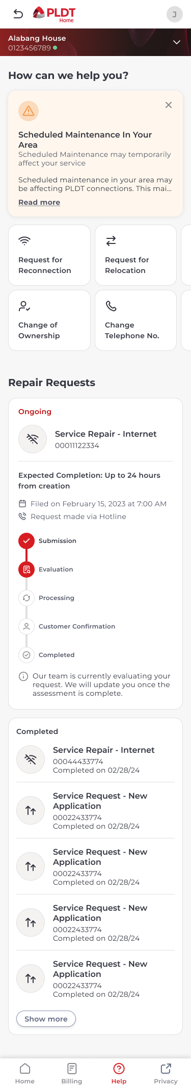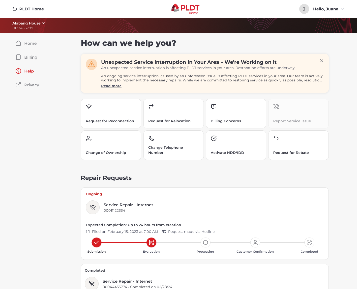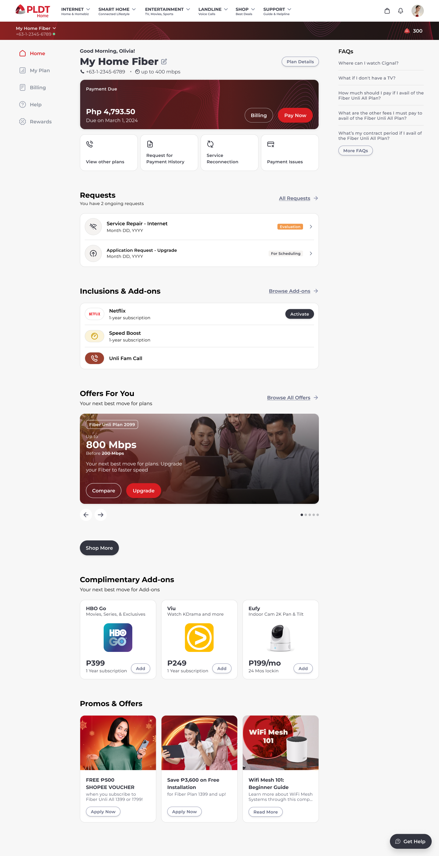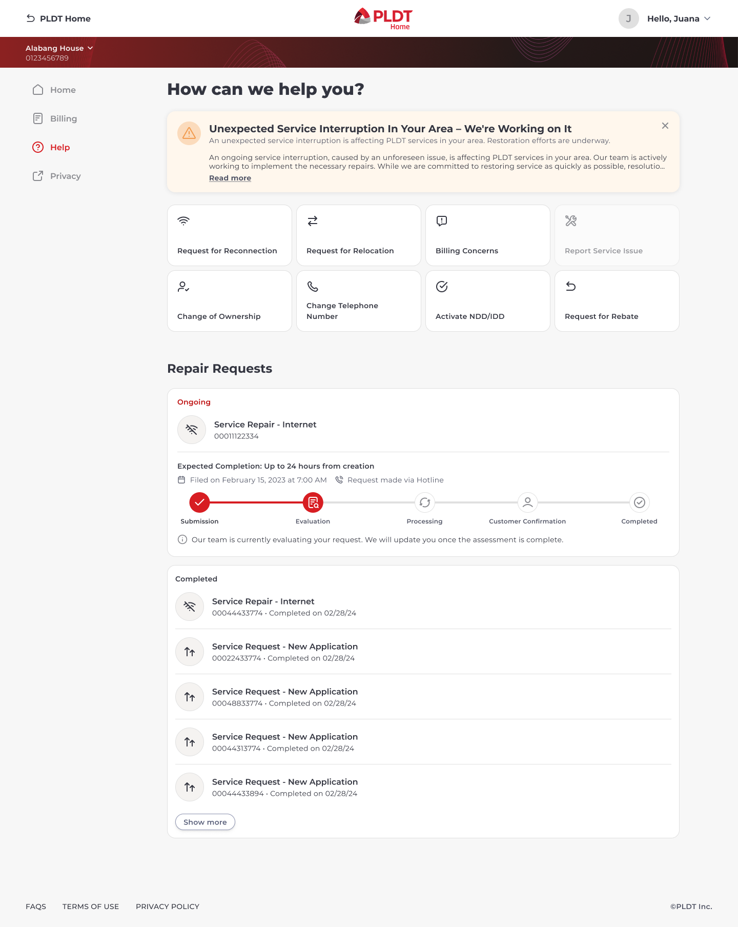The support page required close coordination with the Customer Experience (CX) team since this was the most important part of the portal. At the top, there is a banner that tells the customer if there are any service interruptions happening in their area. This was placed there for emphasis since much of the CX inquiries revolve around that issue.
